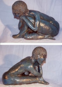 This piece is a delightfully pear-shaped woman in a relaxed pose of contemplation. Thoughtfully gazing upon the ground ahead of her. A modern nude with classic lines, shown in the stylized coils of her hair. The patina used on the entire piece is a smoked turquoise and the hair coils have a highlight of a golden hue.