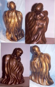 A child held in the strong embrace of a compassionate angel. The androgynous angel is kneeling, tightly clutches a child to itself. The child is enveloped in the folds of the angel’s garb. The child’s peaceful face and encircling arms around the angel’s neck are the only parts visible of the child. The angel’s wings are emphasized in the folds of the robe. The patina is a rich brown gold.
