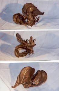 This piece is depicting a dragon in the final throes of death; hope in the ultimate of the despair of death. A saddened face, the wings folding under the weight of mortality, the tail swinging around to the front trying to regain balance and the claws clutching in defeat is shown in great detail portraying its mortal demise.