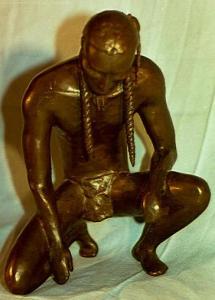 An Apache Hunter in a casual crouch, closely examining tracks on the ground before him. This is a portrait of the quiet solitude and patience of tracking in the deep woods. His hair is twisted into a braid with a single eagle’s feather adorning it. On his chest is the fragment of a beaded pendent.