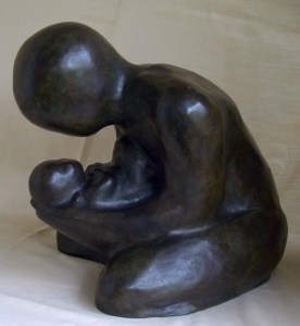 The powerful shape of a man held in awe of his newborn child. The man sitting on his legs, his shoulders hunched in a shielding fashion, is holding his child in front of him to gaze upon it. The man has no distinguishing features on his face and the newborn only slightly more defined. The infant is in a comfortable fetal position lying in its father’s arms.