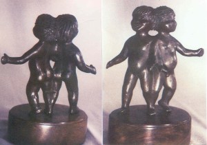 Toddlers shown as conjoined male twins in order to depict the two distinct personalities of Gemini Sign. They are joined at the hip, shoulders, and head, and share one foot. One child is smiling the other somber.