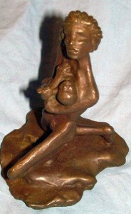 The agony of loss is written harshly across the features of this mother’s face. The body of her lifeless child cradled against her emaciated body as her fingers ripped at her own flesh. The other hand clutching the limp arm of the child. The mother struggles to her feet from the scarred ground which serves as a base. The child lies limp within her arms, the legs dangling and the head lulling back against her arm. The patina is a red earthy brown.